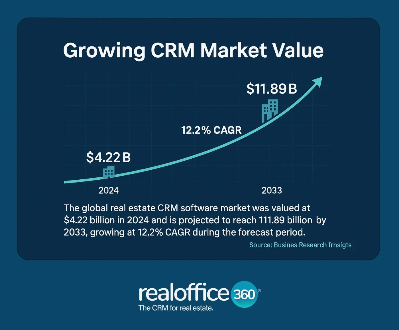The global real estate CRM software market was valued at $4.22 billion in 2024 and is projected to reach $11.89 billion by 2033, growing at a 12.2% CAGR during the forecast period. (Source: Business Research Insights)